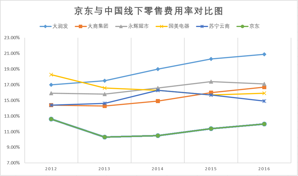 我們再看(kàn)京東(dōng)的(de)費(fèi)用(yφαòng)率與線下(xià)零售商的(de)對(duì)比情況,費(fèi)用(↔₩©λyòng)基本少(shǎo)5-7%,主要(yào)原因一(yī)是(®&©shì)線上(shàng)成本的(de)優勢地(dì)位,二是(shì)λ→♥京東(dōng)運營效率的(de)高(gāo)效。α↕