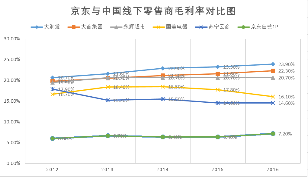 參看(kàn)下(xià)圖,京東(dōng)自(zì)營1P目前的(de)毛利率比線下✔↔(xià)零售商的(de)平均毛利率大(dà)約低(dī)1→∑≠0%,這(zhè)隻是(shì)體(tǐ)現(xiàn)♠✔>京東(dōng)對(duì)供應商的(de←₽)議(yì)價和(hé)京東(dōng)上$✔ε(shàng)的(de)商品低(dī)價情況,并不(bù)涉及履約費(f≤λèi)用(yòng)和(hé)線下(xià)成本的(de)區(qū) ₽φ别。我們可(kě)以看(kàn)出,随著(£↓zhe)一(yī)些(xiē)品類京東(dōng)份額的(de)☆☆逐步提升,京東(dōng)對(duì)供應商議(yì)價能(né♣ng)力肯定逐漸增加,自(zì)營毛利率提升是(shì)大(♥"dà)概率事(shì)件(jiàn)。