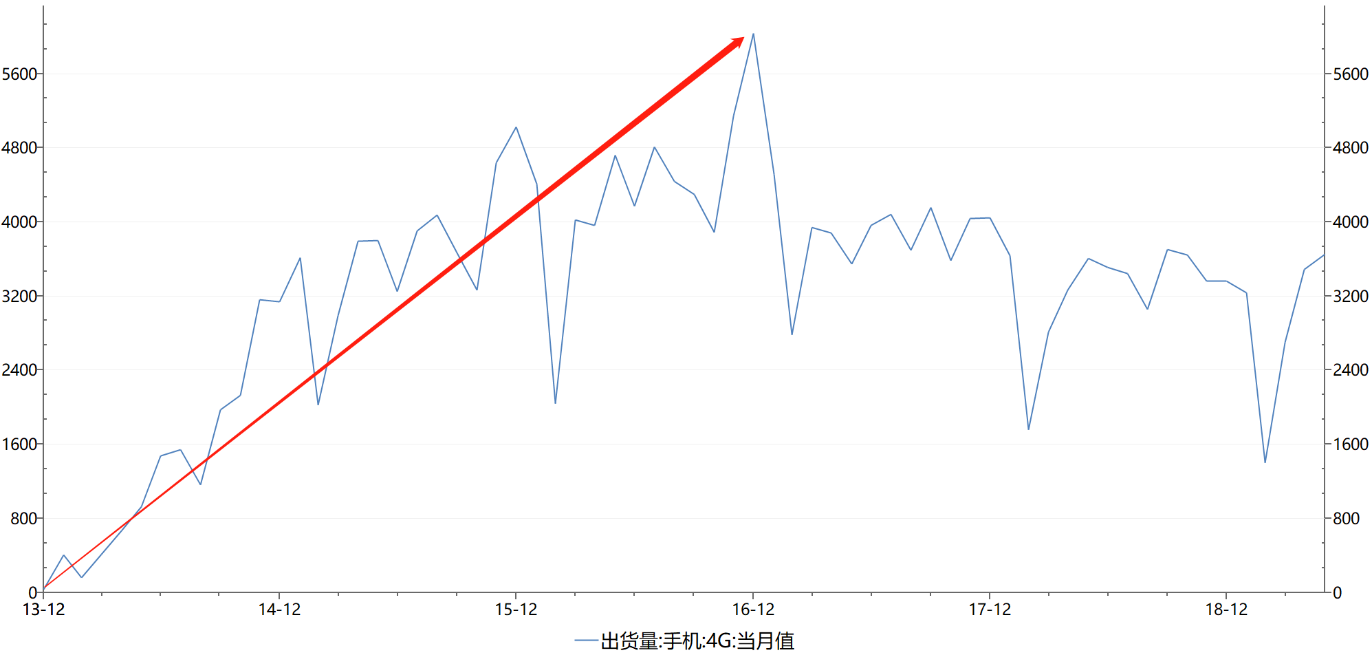 下(xià)圖可(kě)以看(kàn)到(∑ dào),2013年(nián)底4G商用(yòng)開(kāi)始後,4←>G手機(jī)銷量逐月(yuè)攀升,迎來(÷↓×↓lái)爆發式增長(cháng),持續增長(cháng)¥β¥ 3年(nián),直至2016年(nián)底到(dào)達月(yuè)度₽✘♠銷量峰值,随後行(xíng)業(yè)開(kāi)始下(∞✔♠xià)滑。