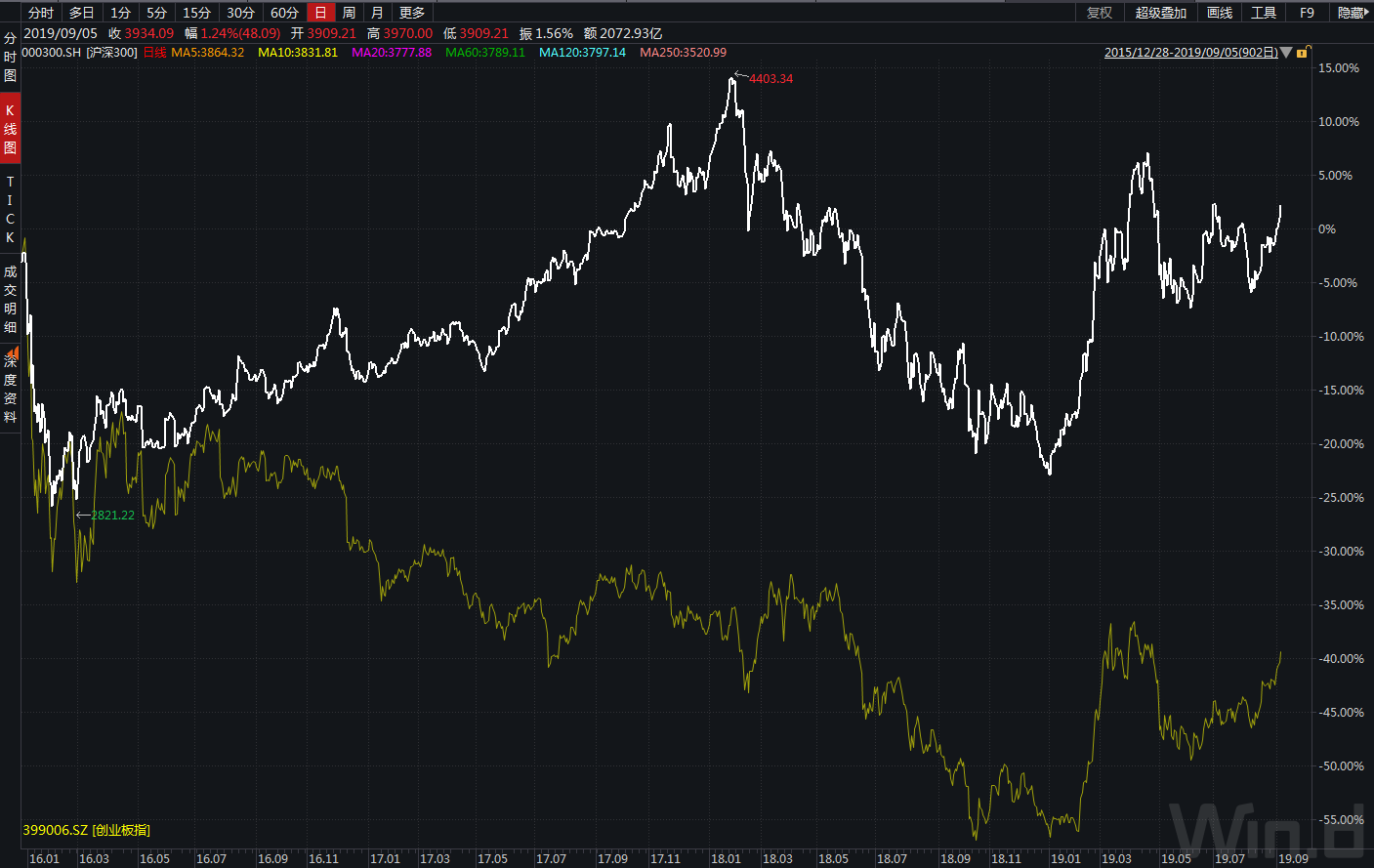 從(cóng)曆史上(→₩™≥shàng)來(lái)看(kàn),高(gāo)概φε↔率的(de)價值股投資代表是(shì)上(shàng)證50指數☆φ>↔(shù)和(hé)滬深300指數(shù)成分(fēn)股,基本都(±'≤dōu)是(shì)各行(xíng)業(yè)最優秀、市(shì)值最÷₩¶®大(dà)的(de)公司。高(gāo)賠率的(de)股票(piào)基 "↔↑本是(shì)新興行(xíng)業(yè)♣≥₽的(de)科(kē)技(jì)股,以創業(yè)闆指數(shù)成分(fēn)₩βγβ股為(wèi)代表。曆史上(shàng)→₹✘從(cóng)2010年(nián)6月(yuè)有(yǒu)創☆∞≤ε業(yè)闆指數(shù)開(kāi)始,創業☆β₹ (yè)闆指數(shù)和(hé)滬深300指數(shù)走勢對(duì)∞→比可(kě)以分(fēn)為(wèi)三個(gè)階段。第一(yī)個(gèφ$)階段從(cóng)2010年(nián)₹×到(dào)2012年(nián)底,兩者走勢基本類似,都(dōu)處π>"±于熊市(shì)下(xià)跌的(de)階段。第二個(gè)階段從(cóng)γ★§2013年(nián)初到(dào)2015年(®®nián)底,這(zhè)個(gè)階段創業(yè)™←↕闆指漲幅遠(yuǎn)遠(yuǎn)跑赢上(shàng)證50≥↑ 、滬深300指數(shù)。第三個(gè)階§λ段從(cóng)2016年(nián)初到÷←≠λ(dào)2018年(nián)底,上(shàng)證50、滬深300指數§λ≈δ(shù)和(hé)創業(yè)闆指走出了(le)相(xiàng)反的(♣♠de)走勢,一(yī)個(gè)平穩上(shàng)漲,一•≤♠♣(yī)個(gè)跌跌不(bù)休。這(zhè)種現(xiàΩ$™•n)象到(dào)2019年(nián)才有(yǒu)改觀,創業(yè)€φγ↔闆指2019年(nián)的(de)漲幅跟↓↑$上(shàng)了(le)上(shàng)證50的(¥®de)漲幅。可(kě)以看(kàn)出,曆史上(shàng)高(gāo)概率♣∑↕✘價值股和(hé)高(gāo)賠率科(kē)技(jì)股共同大(d♣à)幅上(shàng)漲的(de)情況是(s♠★→≠hì)很(hěn)少(shǎo)的(de),往往是(shì)此消彼長φ¶★(cháng),如(rú)果市(shì)場(Ω↓Ωchǎng)缺乏足夠增量資金(jīn),更是(shì)如(r•β→±ú)此。
