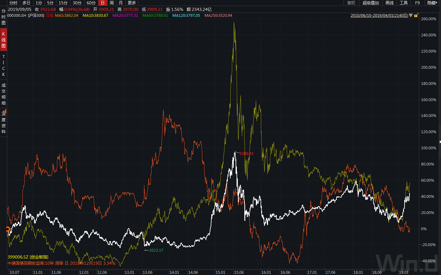 圖三:滬深300、創業(yè)闆指數(shù)疊加10年(nián)期國(g★"uó)債收益率曲線(紅(hóng)色線)
