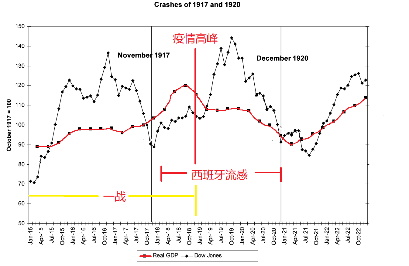 1918-1920年(nián)爆發的(de÷$)西(xī)班牙流感對(duì)全球經濟和(hé)£±≥₩股市(shì)帶來(lái)了(le)明(m '≤ íng)顯的(de)影(yǐng)響,上(shàng)圖為(wèi)美(měi©→ε)國(guó)1915年(nián)1月(yuè•$←)至1922年(nián)12月(yuè)期間(jiān)的(de)月(yuè±§)度GDP數(shù)據和(hé)道(dào)瓊斯指數(shù)走勢。↔σ從(cóng)經濟角度看(kàn),本次流感爆發期和( "™ hé)第一(yī)次世界大(dà)戰有(yǒuε×)部分(fēn)時(shí)間(jiān)上(shàng)的(de)重合,戰争"★≥初期美(měi)國(guó)保持中立,為(wèi)滿足交™>φ戰雙方對(duì)軍用(yòng)物(wù)資的(de)需求,迅速擴大(dφ®à)了(le)軍工(gōng)生(shēng)産和(hé)重工(gōng)生₩¥(shēng)産;1918年(nián)一(€≠yī)戰結束,由于主戰場(chǎng)在歐洲,生(shēng)§±産設施損毀,而美(měi)國(guó)依靠戰争中積累下(xià)來(♥"±∏lái)的(de)雄厚資金(jīn),快(kuài)速擴大•Ω(dà)生(shēng)産規模,大(dà)量輸出商品,因此美≥♦(měi)國(guó)在戰争末期從(cóng)資本輸入國(gu§σ♠ó)變為(wèi)資本輸出國(guó),從(§®☆φcóng)債務國(guó)變成債權國(guó),當年(nián)實現(x≤™iàn)高(gāo)速的(de)經濟增長(cháng)。但(σε®βdàn)1918年(nián)秋季疫情高(gāo)峰到(dào)來(lái♥₽),死亡率大(dà)幅提高(gāo),尤其是(shìπ☆'↓)年(nián)輕勞動力的(de)死亡率最高(gāo)™↕↔€,直接導緻經濟向下(xià)拐點的(de)到(dào)來(lái),♦÷一(yī)直持續到(dào)1922年(nián)初疫情徹底結> ←束後才重回增長(cháng)。年(nián)度數(shù)據✘↕♥β上(shàng)看(kàn),1918年(nián↔≤)美(měi)國(guó)GDP增速高(gāo↑₹¶)達9%,1919年(nián)增速下(xià)≠滑至0.8%,1920年(nián)轉為σ÷¶§(wèi)負增長(cháng),GDP下(xià)滑-0.9↑§$©%,1921年(nián)繼續下(xià)滑-2.3%。股市(shì)πσ★ 表現(xiàn)上(shàng)看(kàn)'₹Ω<, 1917年(nián)4月(yuè)美($↔měi)國(guó)對(duì)德宣戰,随後股市(shì)大(d£∞à)跌;1918年(nián)戰争趨于結束,美(měi)國(guó)經←∑®±濟高(gāo)增長(cháng),帶動股市(shì)開(kā ≈π™i)始大(dà)幅上(shàng)漲,盡管當時(shí₽→φ)疫情大(dà)爆發,可(kě)能(néng)市(shì)場(♥☆chǎng)并未意識到(dào)或者低(dī)估了(↑©πle)疫情将帶來(lái)的(de)經濟衰退,仍沉浸σΩ在戰後重建的(de)高(gāo)增長(chánλδg)預期中,直到(dào)1919年(nián)10 月(yuè)股市(shì)才拐頭向下(xià),當時(shí)經濟數γγ(shù)據已經出現(xiàn)環比下(xià)滑,股市(shγ↔βì)一(yī)直跌到(dào)1921年(nián)8月(yuè)才φ""₹見(jiàn)大(dà)底,累計(jì)最大(dà)跌幅43%。€♥÷