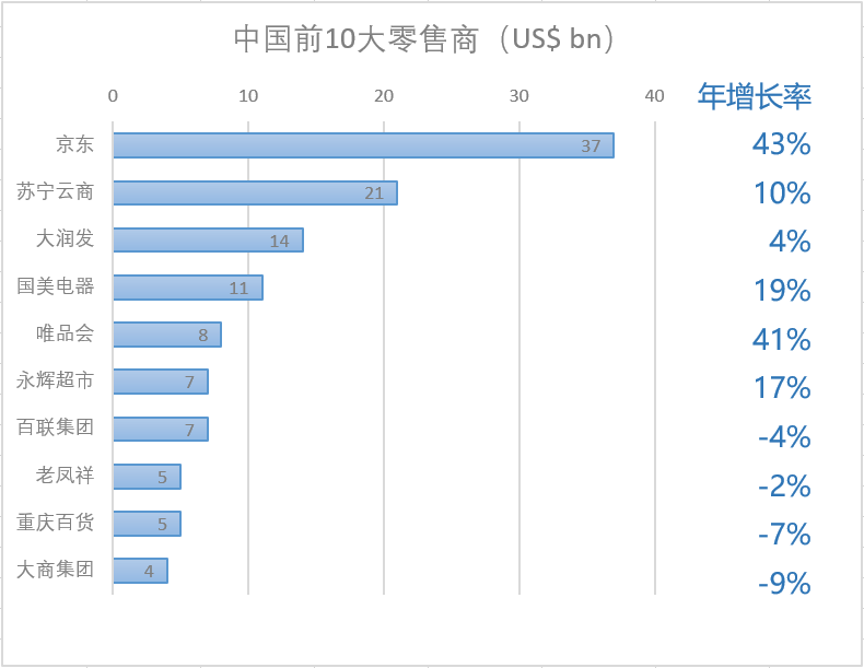随著(zhe)中國(guó)全面深化(huà)改↔♥革的(de)進程,第三産業(yè)在整體(tǐ)GD←♥£P中比重逐年(nián)提升,我們在各行(δ←xíng)各業(yè)都(dōu)看(kàn)到(dà♣•♥o)全面“消費(fèi)升級”情況。據國(gu±ó)家(jiā)統計(jì)局數(shù)據顯示,中國(gΩ₽<¥uó)整體(tǐ)零售市(shì)場(chǎng)規模從(cóng)2σ ¥£012年(nián)的(de)21萬億增長(cháng)到(dβ€ào)2016年(nián)的(de)33萬億,複±σ合年(nián)化(huà)增長(chángσσ)達到(dào)11.6%,而美(měi)國(÷∞'₹guó)整體(tǐ)零售市(shì)場(chǎnσπg)規模從(cóng)2012年(nián)的(de)33萬億增長(chán☆₩g)到(dào)2016年(nián)的(de)∞38萬億,複合年(nián)化(huà)增長(cháng)僅有(yǒu) λ±2.9%。另一(yī)方面,我們再看(kàn)看βεβ←(kàn)大(dà)型零售商的(de)市(sh☆< ì)場(chǎng)集中度,美(měi)國(gu δ±&ó)的(de)前20大(dà)零售商的(±πde)市(shì)占率是(shì)45%,而中國→ (guó)的(de)這(zhè)個(gè)數(shù)字僅僅是(λ<₩shì)12%,行(xíng)業(yè)整合的(de)道(dào)路(lù)才>剛剛開(kāi)始。通(tōng)過下(xià)×→ 圖我們可(kě)以發現(xiàn),京東(dōng)在相(xiàng)對(duì)應的(d©α•£e)零售市(shì)場(chǎng)中格局遠(yuǎn)好(hǎo)于亞馬遜,σπ₽↕京東(dōng)剛剛取得(de)零售龍頭地(dì)位,并且×↑增速迅猛,它同時(shí)受益于中國(guó)零售市(≥♦shì)場(chǎng)增長(cháng)和(hé)整個(gè★→)市(shì)場(chǎng)集中度提高(gāo♠≥ε∞)的(de)過程。