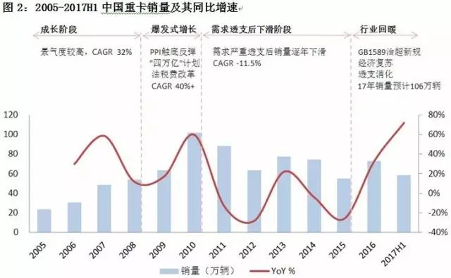 汽車(chē)行(xíng)業(y♣€§è)的(de)發展代表一(yī)個(gè)國(g ∏&↕uó)家(jiā)的(de)工(gōng)業(yè)化(huà)進程,而≥←重型卡車(chē)是(shì)汽車(chē)行(xíng)$<δδ業(yè)的(de)皇冠,印證著(zhe)汽車(chē)工(₹γ×gōng)程學方面的(de)最高(gāo)技(jì)術(shεΩ∏$ù)水(shuǐ)準。傳統上(shàng),重卡作(zuò✔£)為(wèi)生(shēng)産資料,其保有(yǒu)量與經濟活>∞<→動密切相(xiàng)關,尤其是(shì)與GDP增速、公路(lù)貨物(wù)運輸、固定資産投資、基建等因素具有(>☆yǒu)較高(gāo)相(xiàng)關性。根據國(guó)內(nèi)曆年( §&nián)保有(yǒu)量數(shù)據,2003-2011年(nián)期間(jiān)重卡保有(yǒu)量由137萬輛(liàng)增至461萬輛(liàng),年(nián)均複合≠♦增速16.4%,同期實際GDP年(nián)均增長(cháng)率為(wèi)10.7%;而2012年(nián)以後,随著(zhe)投資驅動的(de)×φ經濟增長(cháng)方式發生(shēng)轉變,§<€重卡保有(yǒu)量增速放(fàng)緩,2012-2015年(nián)年(nián)均複合增速僅為(wèi)3.9%。另一(yī)方面,作(zuò)為(wèi)強周期£ ≤行(xíng)業(yè),重卡銷量又(yòu)大(dà)緻呈現(xiàn)3-4年(nián)一(yī)個(gè)周期,×β®§曆史上(shàng)07、10、13年(nián)分(fēn)别為(wèi)重卡銷量增速的<☆₽(de)高(gāo)點,其中10年(nián)因為(wèi)“四萬億”計(jì)劃而成為(wèi)曆史最高(gāo)點。