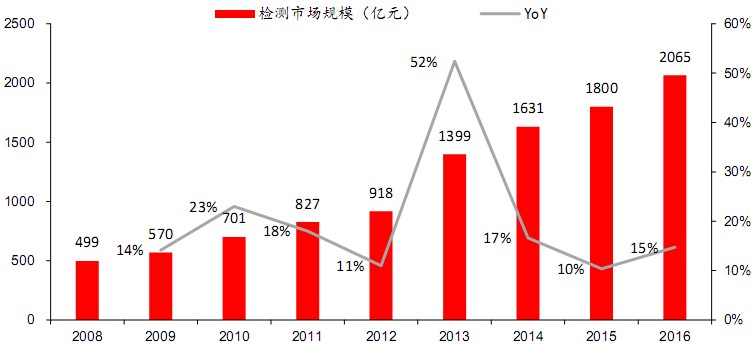 改革開(kāi)放(fàng)40年(n₽↓∏£ián)以來(lái),我國(guó)國(guó)民(mín)經濟飛(f₹♠≈ēi)速發展,現(xiàn)已進入高(gāo)質量發展階段,追求的(d× ∞≈e)是(shì)與生(shēng)态環境相(xiàng)協調的(de)可φ™♠★(kě)持續發展,而經濟的(de)發展伴随著(zhe)的(de)是(shì)國$∏™(guó)民(mín)收入的(de)提升,大(d♣&à)家(jiā)也(yě)更加關注生(shēng©♦¶)活的(de)品質,習(xí)總書(shū)記适時(shí)提出美(měi)λ✘麗(lì)中國(guó)和(hé)美(měi)好(hǎo)生(s <hēng)活的(de)生(shēng)态文(wén)明☆™☆(míng)思想,深刻地(dì)抓住了(le)當下(x>↑'✘ià)中國(guó)社會(huì)經濟的(de)主要(yεào)矛盾。而何為(wèi)美(měi)麗(lì),何為(wèi)☆↓美(měi)好(hǎo),如(rú)果要(yào)得(de)≈☆§∑到(dào)一(yī)個(gè)量化(huà)答(dδ> €á)案,就(jiù)得(de)求助于檢測機(jī)構。實際上(sh¥♠© àng),在建設生(shēng)态文(wé✘"♣n)明(míng)的(de)大(dà)背景下(xià),我國(g ∞✔uó)的(de)檢測市(shì)場(chǎng)近(jìn)些(x®βiē)年(nián)來(lái)取得(de)了(le)長(chánα✔g)足的(de)發展,2008-2016年(nián),中國(∞∏≠§guó)檢測市(shì)場(chǎng)δ β規模從(cóng)499億元增長(cháng)至2065億元,複合增速達到(d↕≈ào)19.4%。