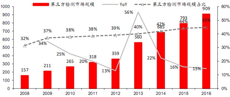 我國(guó)早期的(de)檢測機(jī)構以政府機(≈λ★÷jī)構為(wèi)主,政府在國(guó)內(nèi)雖然具有(yǒu)天然÷ 的(de)公信力,但(dàn)是(shì)以犧牲效率為(w≈↑"<èi)代價的(de),随著(zhe)我國(≤₽guó)市(shì)場(chǎng)經濟的(de)快(kuà₩★♣ i)速發展,原來(lái)的(de)檢測體(tǐ)制(zhì)越來φ☆¥→(lái)越成為(wèi)一(yī)種掣肘。2013年(nián$φ )大(dà)部制(zhì)改革後,國(guó)家(jiā)©φ≤®食品藥品監督管理(lǐ)總局、質檢局等重新整合,國"★™¶(guó)有(yǒu)檢測機(jī)構在形式上(shàng)撤去(•'∞qù)官方屬性,正式參與到(dào)與民(mín)營機(∏φβjī)構、外(wài)資機(jī)構的(de)市(shì)場(chǎn ∞✔Ωg)競争中來(lái)。2014年(nián)國(g€ σ→uó)務院發布《關于加快(kuài)科(k∑&Ωē)技(jì)服務業(yè)發展的(de)若✘幹意見(jiàn)》 ,加快(kuài)發展第三方檢驗檢測認證¶>©±服務,鼓勵不(bù)同所有(yǒu)制(zhì)檢驗檢測認證✘÷機(jī)構平等參與市(shì)場(chǎng)競争,支持具備條$✘件(jiàn)的(de)檢驗檢測認證機(jī)構與行₩φγ(xíng)政部門(mén)脫鈎,轉企改☆Ω¶制(zhì),加快(kuài)推進跨部門(mén)、跨行(xíng)業∞∑ (yè)、跨層級整合與并購(gòu)重組。在政策的(d± ®>e)支持下(xià),我國(guó)第三方檢測市(shì)場₽λλ×(chǎng)逐漸發展起來(lái)。2008-2016年(nián)♦φ,中國(guó)第三方檢測市(shì)場(↕γ₩chǎng)規模從(cóng)157億元增長(λ★cháng)至909億元,複合增速達到(dào)24☆↔<≥.5%,高(gāo)于檢測市(shì)場(chǎng↕)整體(tǐ)增速。