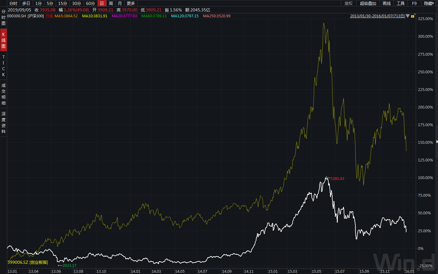 圖1:2013年(nián)1月(yuè)-∑≠♣2015年(nián)底創業(yè)闆指(黃(huá✘÷ng)色線)和(hé)滬深300(白(bái)色線)漲幅圖