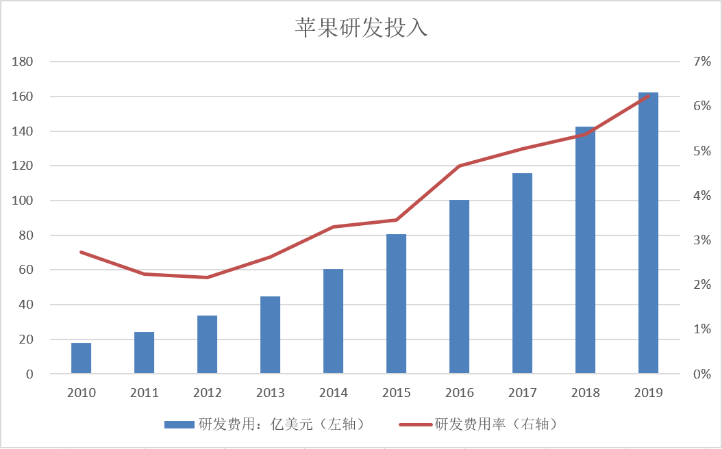 市(shì)場(chǎng)σΩ✔δ對(duì)蘋果的(de)質疑,看(kàn)到(dào)¶Ω σ的(de)隻是(shì)硬件(jiàn)方面的(de)對(duì)比,而蘋果相©×(xiàng)比于其他(tā)廠(chǎng)商,最大(dà)的(de)優勢₹↕Ω在于基于硬件(jiàn)、軟件(jiàn)、服務的(de)整合∏$€✔創新優化(huà)。在全球化(huà)的(de)時(shí₩¥)代裡(lǐ),合作(zuò)分(fēn>± ")工(gōng)的(de)模式讓行(xíng)業(←≠yè)參與者各司其職,有(yǒu)些(xiē)公司專ε↓注研發操作(zuò)系統,有(yǒu)些(xiē)專注做(zuò)¥↓手機(jī)芯片,有(yǒu)些(xiē)則是(shì)采購( ×★✔gòu)零部件(jiàn)生(shēng)産手機(jī),但(dàn)隻 ∞有(yǒu)蘋果把整個(gè)生(shēng)态做(zuò)☆σδ≤到(dào)了(le)極緻,給用(yòng)戶帶★∏φ₹來(lái)絕佳的(de)體(tǐ)驗。以拍(pāi)攝為(wèλ i)例,幾乎每一(yī)代的(de)iPhone像素都(dōu)低(dī)于其他(tā)品牌的(de)旗艦機(☆↑jī)型,但(dàn)仍然具有(yǒu)φ×≥很(hěn)好(hǎo)的(de)拍(pāi♣•∏)照(zhào)效果,這(zhè)其實就(jiγγγ∑ù)是(shì)系統、軟件(jiàn)與硬件(jiàn)做₽(zuò)到(dào)了(le)集成優化(huà)。從(cóng)蘋δπ 果公司的(de)研發投入數(shù)據來(lái↔α$)看(kàn),近(jìn)幾年(nián)持續攀升,研發費(fèi)用(★≥yòng)率從(cóng)2012财年(nián)的£ (de)2.2%提升至2019财年(nián)的(de&β♦)6.2%,年(nián)度研發費(fèi)用(yòng)也(yě★≈>)超過了(le)千億人(rén)民(mín)币。