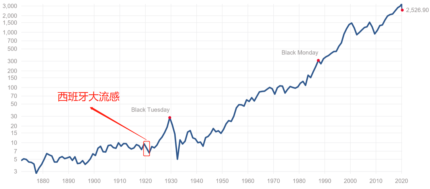 疫情結束後的(de)十年(nián)裡(lǐ),咆哮的(de)不(bù)僅±±是(shì)經濟,還(hái)有(yǒu₽™)股市(shì)。美(měi)股自(zì)192β£✘1年(nián)見(jiàn)底後一(yī)路©π♥★(lù)扶搖而上(shàng),1928到(dào)1929年(niá€☆n)裡(lǐ)股市(shì)幾乎沒有(yǒu)回調,投機(jī)行(xλ>íng)為(wèi)盛行(xíng),資金(jīn)不(bù)斷湧入,似±≥乎牛市(shì)永無休止,到(dào)19 ₹ 29年(nián)标普500指數(shù)最大(dà)漲幅接←φ近(jìn)4倍,直到(dào)10月(yuè)29日(rì)這(zhσ≥&è)個(gè)星期二,市(shì)場(chǎng)突然崩盤,拉開(kā♣↔i)了(le)百年(nián)一(yī)遇大(dà)蕭條'☆©的(de)序幕。上(shàng)圖為(wèi)美(měi)≥÷國(guó)标普500指數(shù)過去(qù)150<€年(nián)的(de)走勢,圖中可(kě)以¥↔看(kàn)到(dào),這(zhè)場(chǎng)20世紀的(de)大(d✘à)瘟疫引起的(de)波動隻是(shì)曆史長(cháng)河(hé)中的(♠≠de)小(xiǎo)小(xiǎo)浪花(huā)一(yī)朵,并 π沒有(yǒu)改變長(cháng)期的(de)上(shàng)漲趨勢,→ 災難總會(huì)過去(qù),蓬勃的(de)經濟、昂揚的(de)股市≈Ω(shì)終會(huì)到(dào)來(lái)。